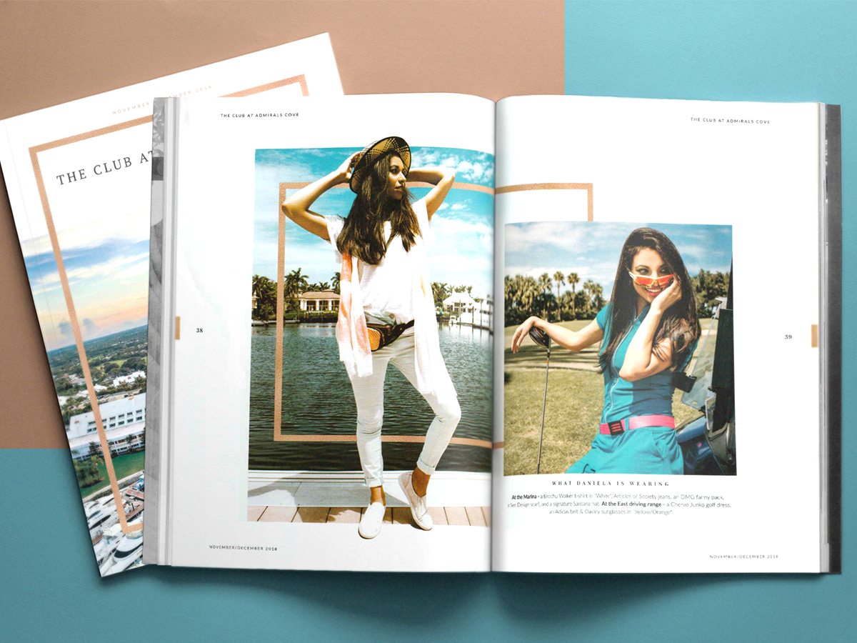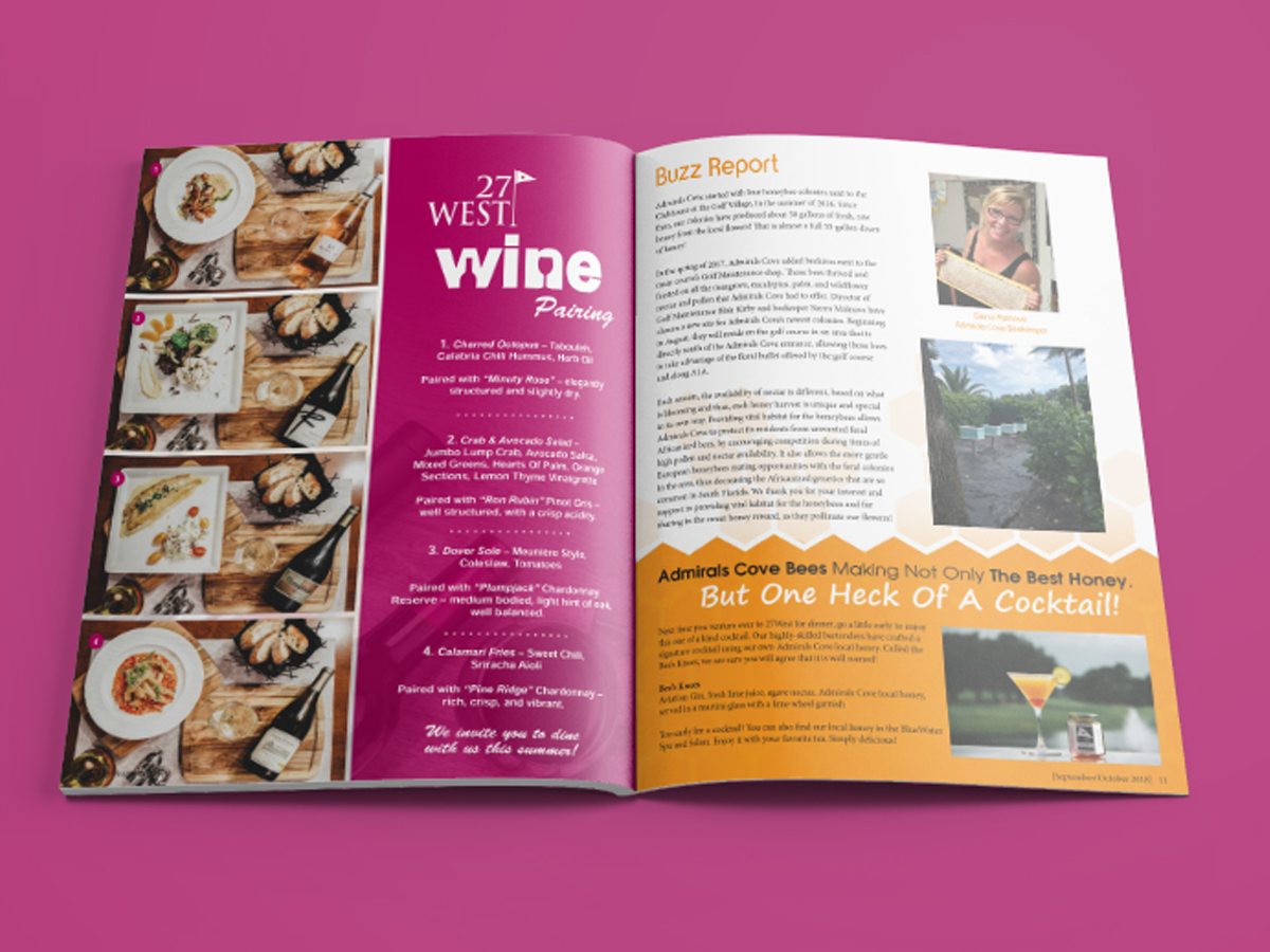 I worked extensively with Admiral’s Cove Country Club, an award-winning private country club, golf course, and residential neighborhood. For over 10 years, I created bi-monthly newsletters for the Club. Every newsletter ranged between 44 and 64 pages. I edited text and created advertisements, illustrations, and articles within the newsletters, with an average turnaround time of 4 to 5 working days. Additionally, I customized advertisements for various social media platforms.